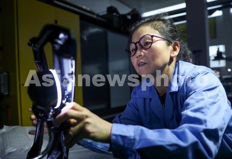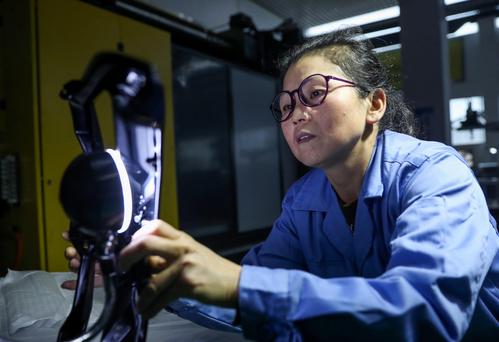 2021年12月22日,四川省华蓥市正大汽车配件厂在的员工, 在检查利用智能机器人赶制出的产品的质量。