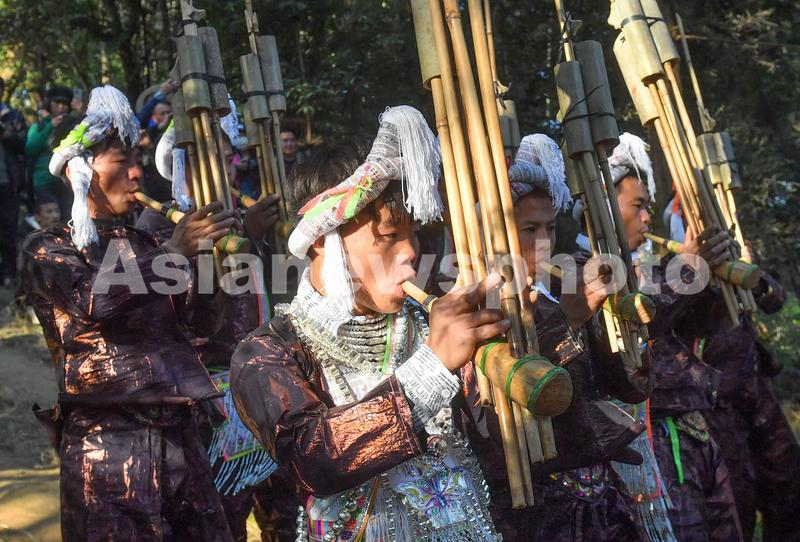 图片说明:12月22日,贵州省从江县丙妹镇岜沙苗寨芦笙手相聚在苗寨东方坡吹奏芦笙欢庆芦笙节。