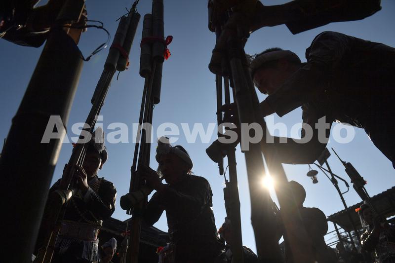 图片说明:12月22日,贵州省从江县丙妹镇岜沙苗寨芦笙手在寨子里吹奏芦笙欢庆芦笙节。