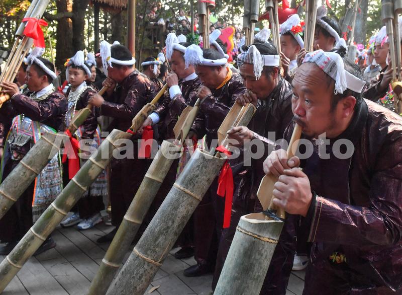 图片说明:12月22日,贵州省从江县丙妹镇岜沙苗寨芦笙手相聚在苗寨芦笙堂吹奏芦笙欢庆芦笙节。