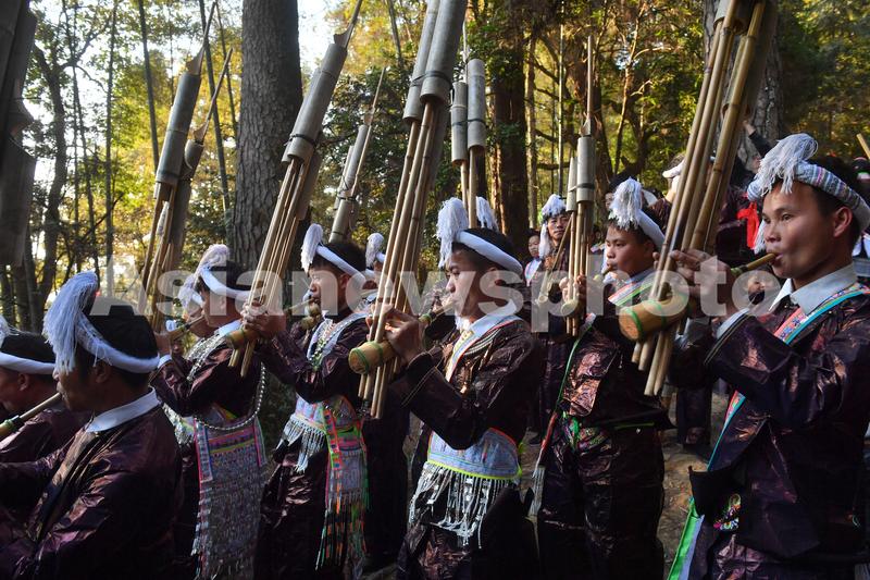 图片说明:12月22日,贵州省从江县丙妹镇岜沙苗寨芦笙手相聚在苗寨东方坡吹奏芦笙欢庆芦笙节。