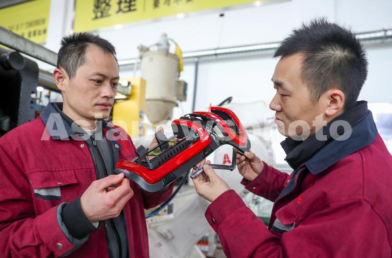 2021年12月22日,四川省华蓥市正大汽车配件厂在的员工, 在检查利用智能机器人赶制出的产品的质量。