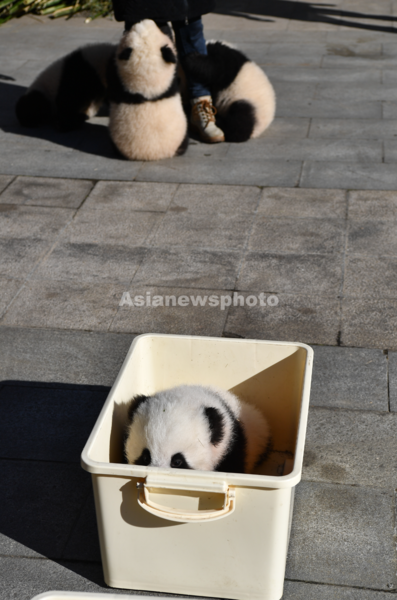 图片说明:12月22日,中国大熊猫保护研究中心卧龙神树坪基地内,工作人员将今年出生的部分大熊猫幼崽抱出圈舍享受“日光浴”。