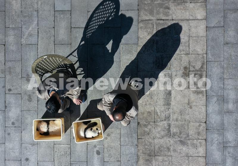 图片说明:12月22日,中国大熊猫保护研究中心卧龙神树坪基地内,工作人员将今年出生的部分大熊猫幼崽抱出圈舍享受“日光浴”。