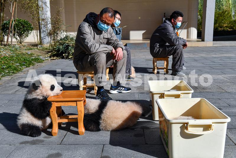 图片说明:12月22日,中国大熊猫保护研究中心卧龙神树坪基地内,工作人员将今年出生的部分大熊猫幼崽抱出圈舍享受“日光浴”。