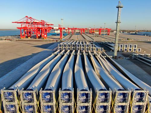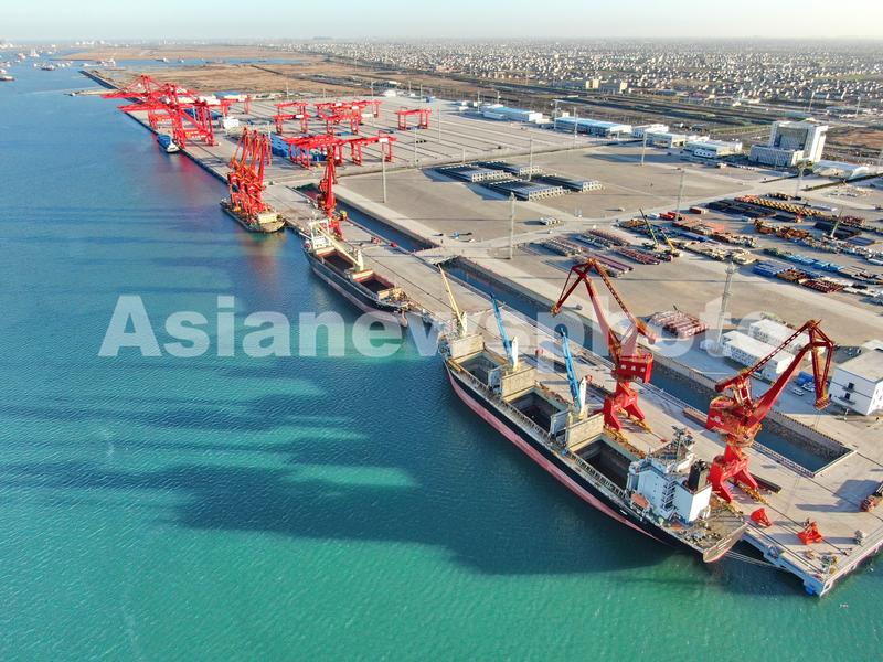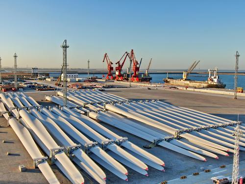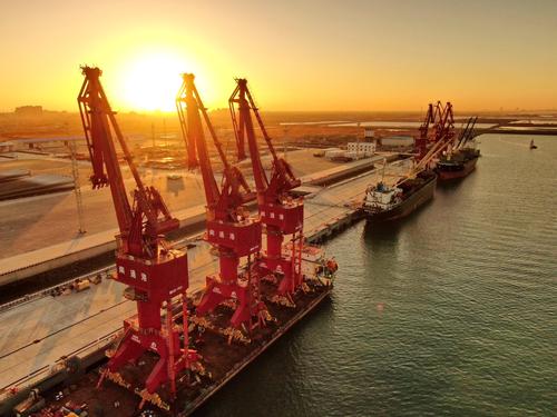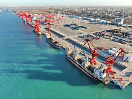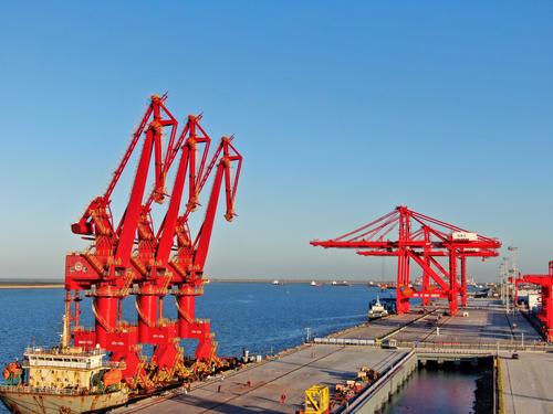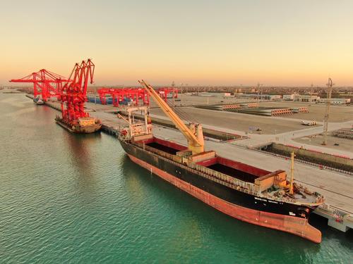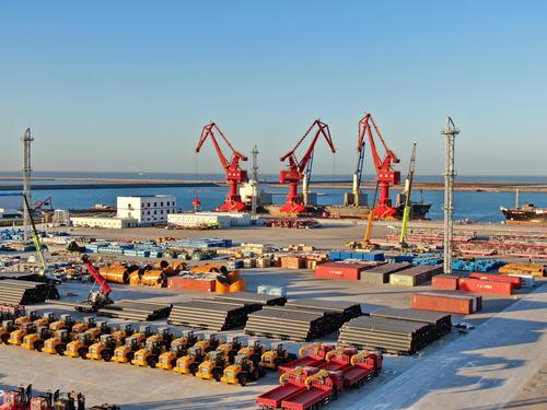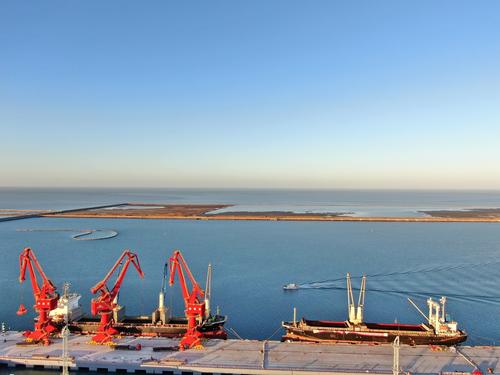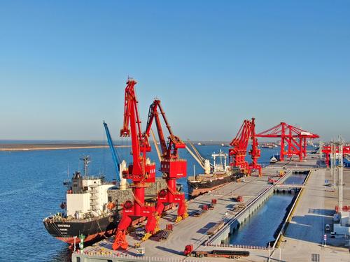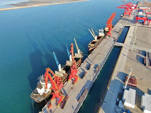 图片说明:2021年12月23日在江苏启东拍摄的刚刚启用的通州湾新出海口吕四起步港区10万吨级通用码头。