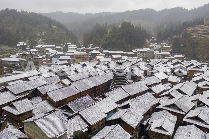 图片说明:2021年12月26日,在贵州省从江县往洞镇增冲村拍摄的雪景(无人机照片)。