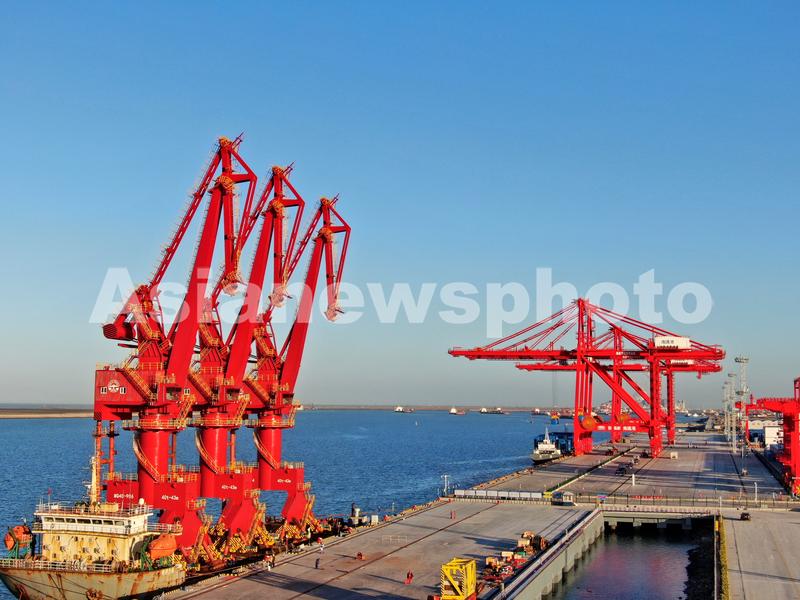图片说明:2021年12月23日在江苏启东拍摄的刚刚启用的通州湾新出海口吕四起步港区10万吨级通用码头。
