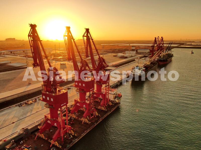 图片说明:2021年12月23日在江苏启东拍摄的刚刚启用的通州湾新出海口吕四起步港区10万吨级通用码头。