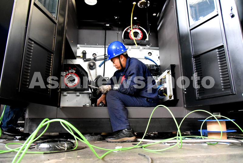 图片说明:2021年12月28日,连云港市海州高新区新浦工业园一家机械设备制造小巨人企业,工人正在安装一批纺织用烫光机。