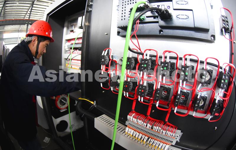 图片说明:2021年12月28日,连云港市海州高新区新浦工业园一家机械设备制造小巨人企业,工人正在安装一批纺织用烫光机。