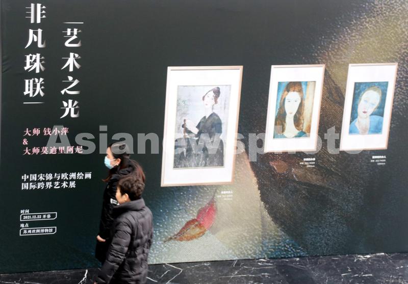 2021年12月29日,观众在中国宋锦和欧洲绘画国际跨界艺术展上参观。近日,中国宋锦和欧洲绘画国际跨界艺术展在江苏苏州丝绸博物馆开展。本次展览以“非凡珠联 艺术之光”为主题,展出中国宋锦大师钱小萍的20余件宋锦精品和欧洲绘画大师莫迪里阿尼的30幅绘画精品,让观众同时领略两种艺术形式的魅力。展览将持续至2022年3月27日。