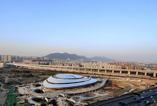 图片说明:2021年12月29日,浙江省杭州市拱墅区北景园生态公园里2022年杭州亚运会电竞场馆项目加紧建设中。