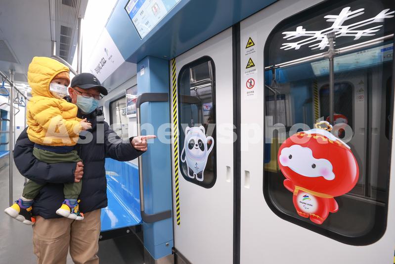 图片说明:2021年12月31日,家长抱着孩子在北京地铁11号线观看北京冬奥会和冬残奥会吉祥物“冰墩墩”和“雪容融”。