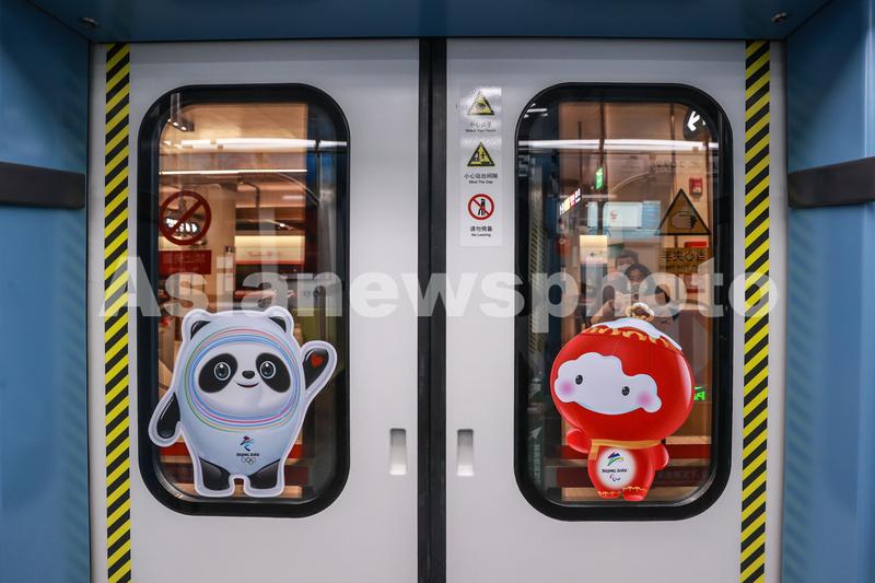 图片说明:2021年12月31日,北京地铁11号线车厢门上的北京冬奥会和冬残奥会吉祥物 “冰墩墩”和“雪容融”图案。