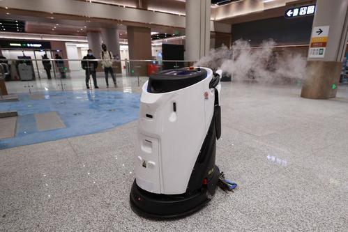 图片说明:2021年12月31日,北京地铁11号线西段,消毒机器人正在作业。