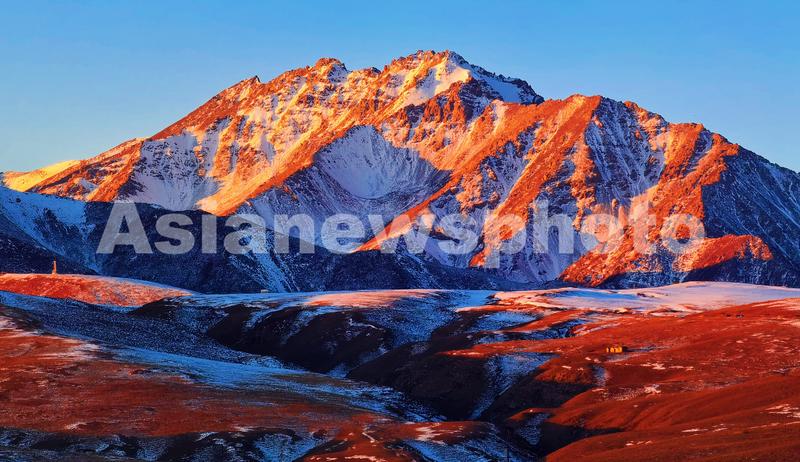 2022年1月1日,甘肃张掖肃南裕固族自治县大河乡巴尔斯雪山上,祁连山雪峰在日照下成为了“金山”。