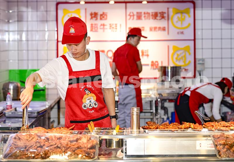 图片说明:2021年12月31日,商家工作人员在呼和浩特市新华广场地铁网红街里的美食街制作美食。