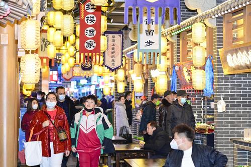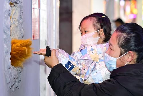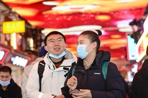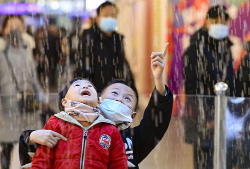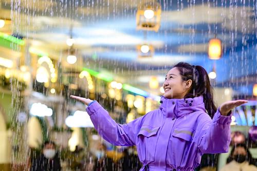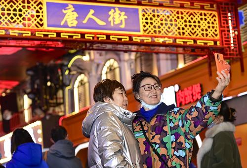 图片说明:2021年12月31日,游客在呼和浩特市新华广场地铁网红街特效天幕街区拍照留念。