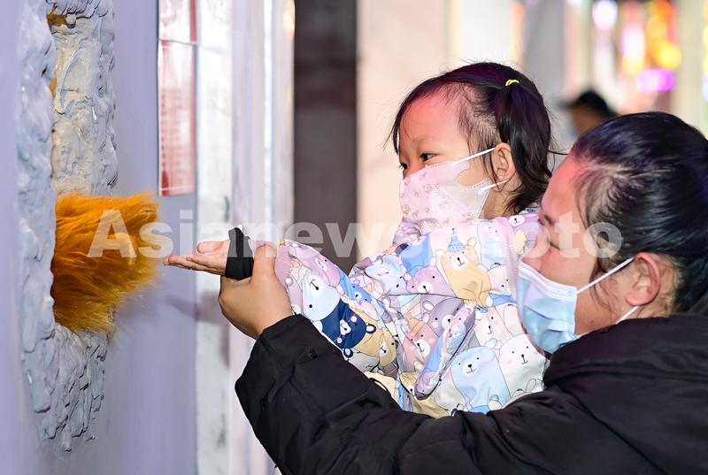 图片说明:2021年12月31日,游客在呼和浩特市新华广场地铁网红街与商家玩偶互动。