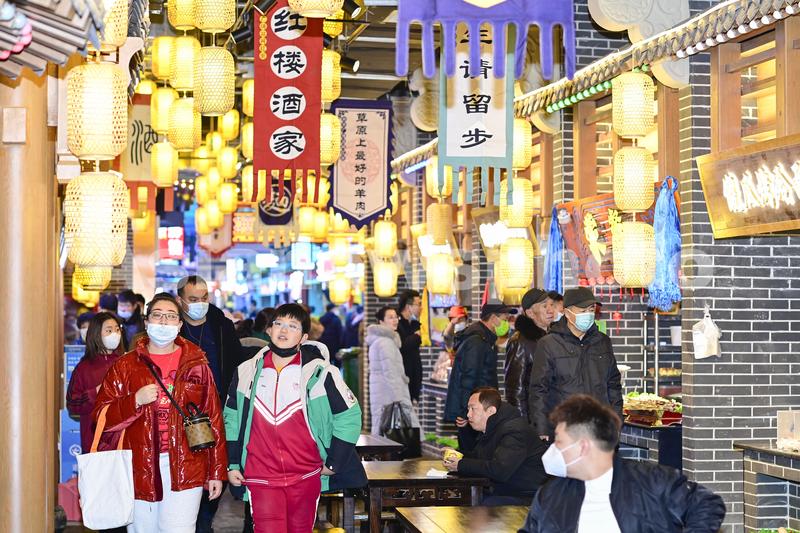 图片说明:2021年12月31日,游客在呼和浩特市新华广场地铁网红街里的美食街行走。