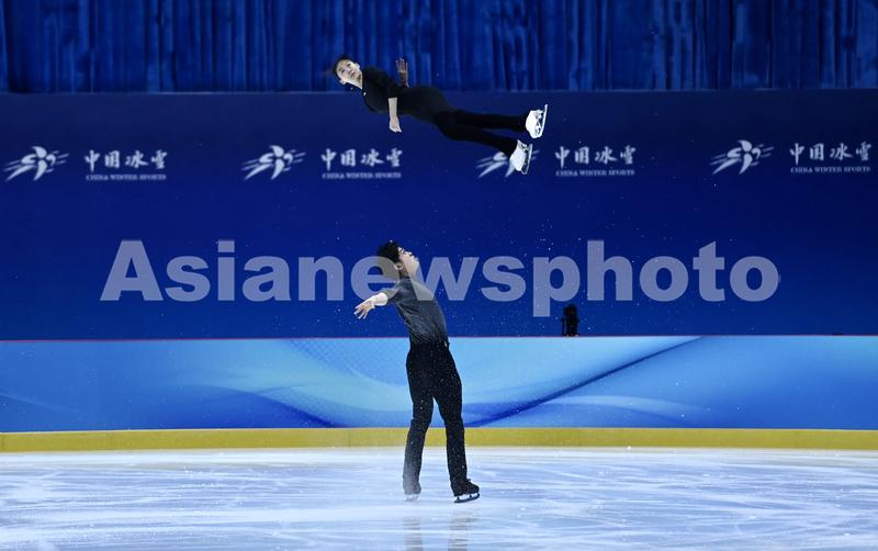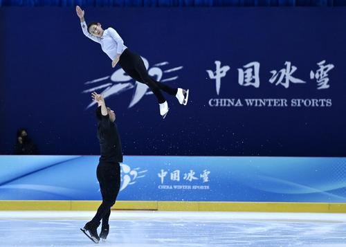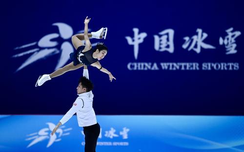 花样滑冰国家队队员王瑀晨(上)/黄一航在训练中。