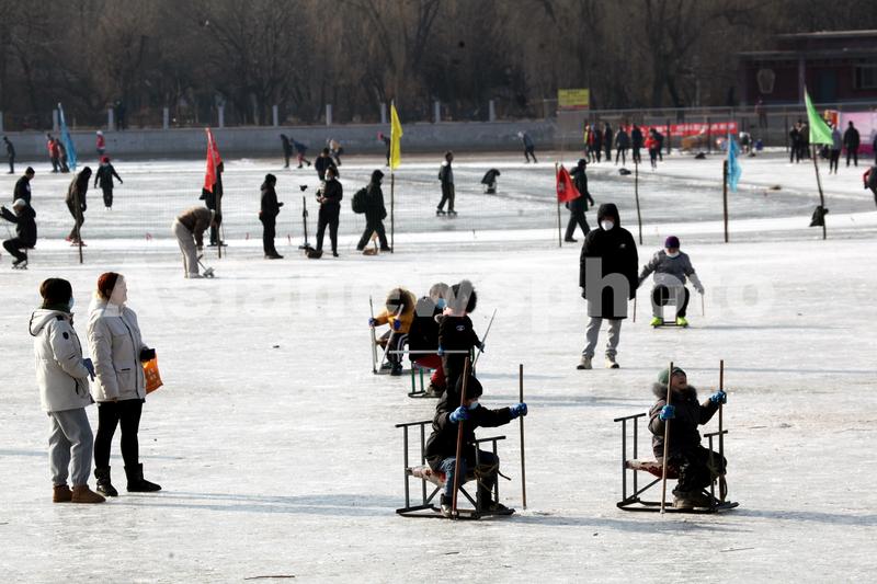 图片说明:2022年1月5日,沈阳市劳动公园人工湖上,市民进行冰上运动。