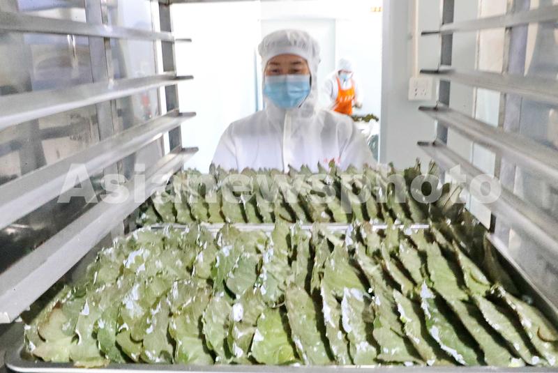 2022年1月6日,位于河北省秦皇岛市海港区石门寨镇浅水营南村的木兰农业开发有限公司内,工人在桲椤叶饼加工车间忙碌。