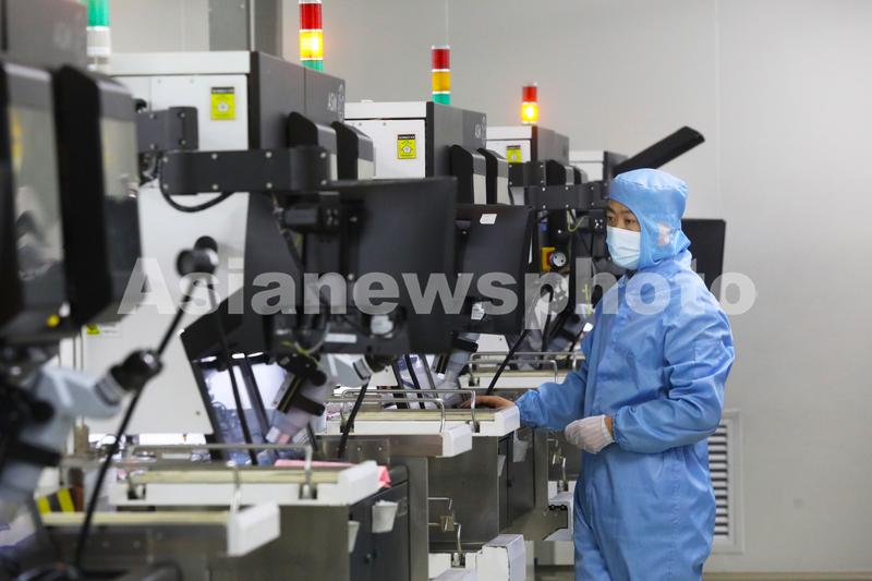 2022年1月6日,重庆梁平区高新区的重庆平伟实业股份有限公司无尘生产车间,工人通过电子显示屏观察测试设备运行情况。