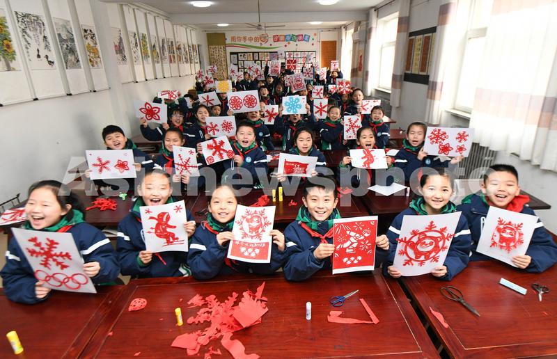 2022年1月6日,在河北省石家庄新乐市实验小学美术教室,学生们展示自己的迎冬奥剪纸作品。