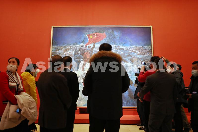 图片说明:1月7日,观众和嘉宾欣赏冯杰的画作《征服珠峰》。