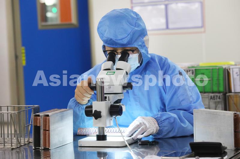 2022年1月6日,重庆梁平区高新区的重庆平伟实业股份有限公司无尘生产车间,技术员在检测功率半导体器件。