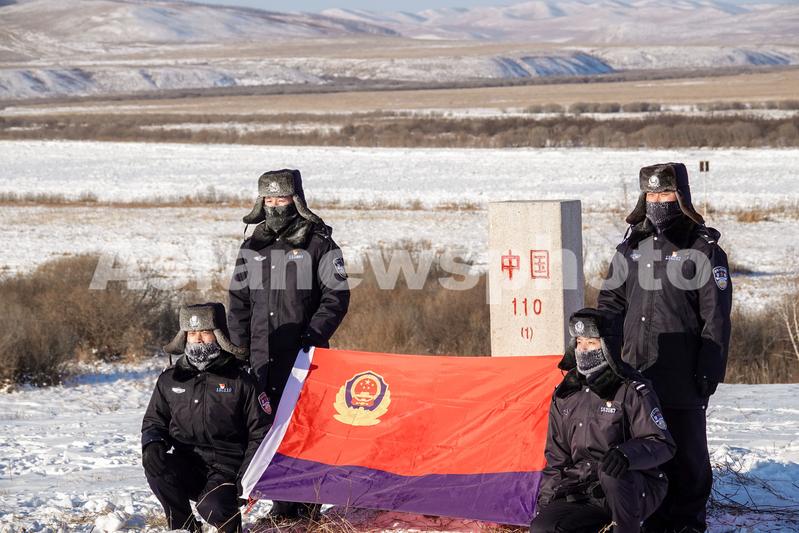 图片说明:2021年1月6日,驻守在中俄边境一线的内蒙古出入境边防检查总站呼伦贝尔边境管理支队室韦边境派出所组成巡护分队对中俄边境前沿重点地带开展日常巡逻、踏查工作,图为在中俄110号界碑前面对警旗宣誓后合影。