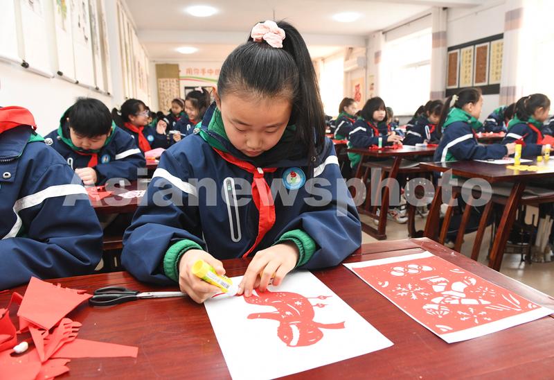 2022年1月6日,在河北省石家庄新乐市实验小学美术教室,学生们在创作迎冬奥剪纸作品。