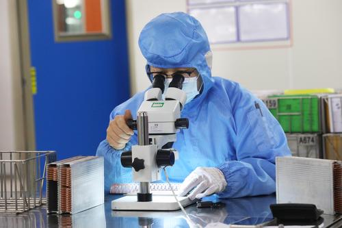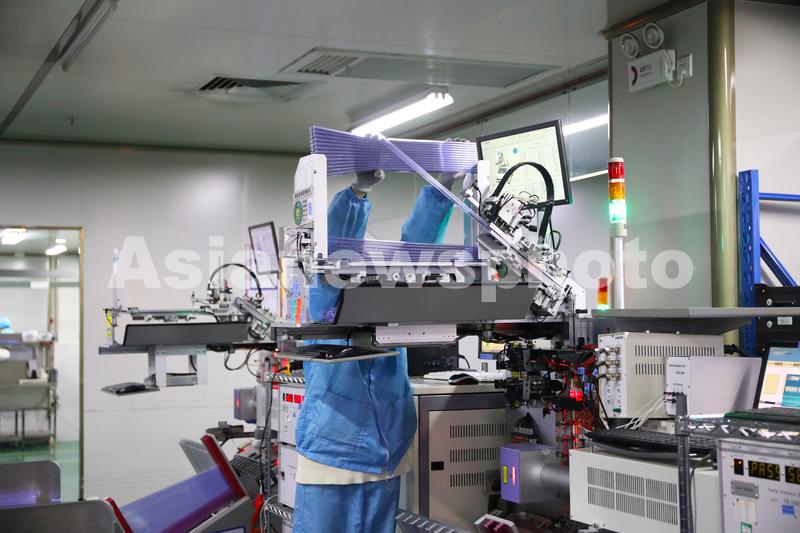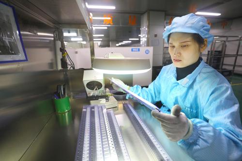 2022年1月6日,重庆梁平区高新区的重庆平伟实业股份有限公司生产车间,工人在给测设机器上电子材料。