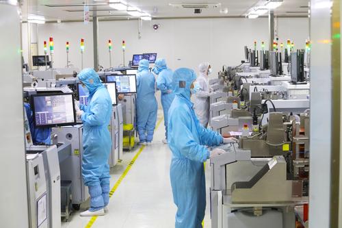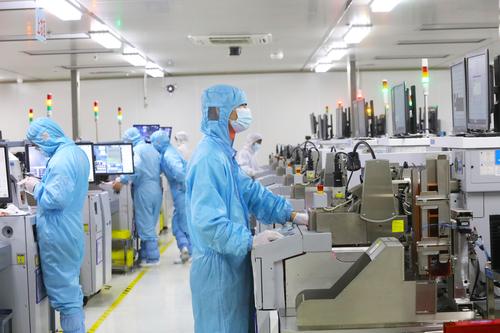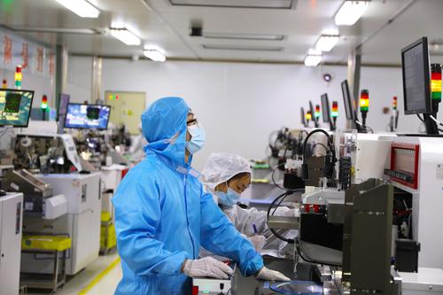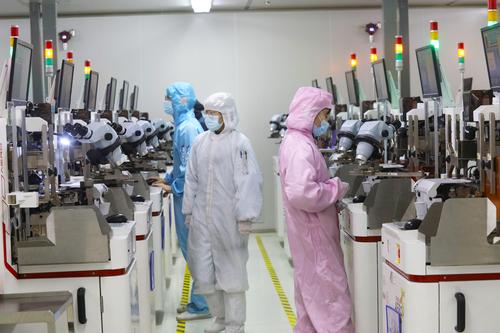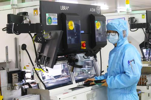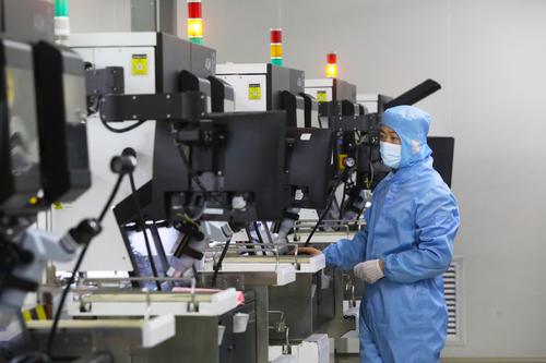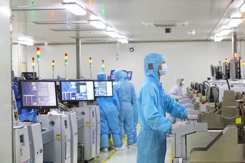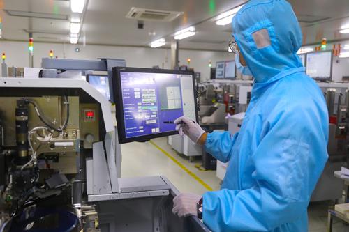 2022年1月6日,重庆梁平区高新区的重庆平伟实业股份有限公司无尘生产车间,工人通过电子显示屏观察电子芯片的生产情况。近年来,梁平区积极抢抓成渝地区双城经济圈建设和承接沿海地区、重庆主城都市区产业转移的机遇,大力实施以大数据智能化为引领的创新驱动发展战略,通过招大引强、科技赋能、补链延链等举措,打造了以设计、制造、封测、应用等产业为主导的集成电路产业集群,带动了当地经济高质量发展。