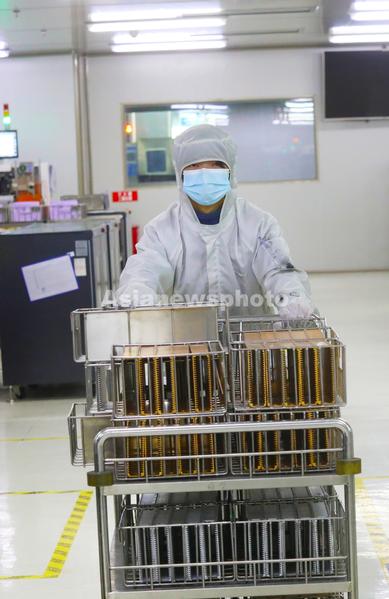 2022年1月6日,重庆梁平区高新区的重庆平伟实业股份有限公司无尘生产车间,工人在运输功率半导体器件。