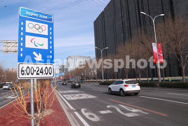 2022年1月8日,在北京朝阳区北辰西路拍摄的北京2022年冬奥会、冬残奥会专用车道标志牌。