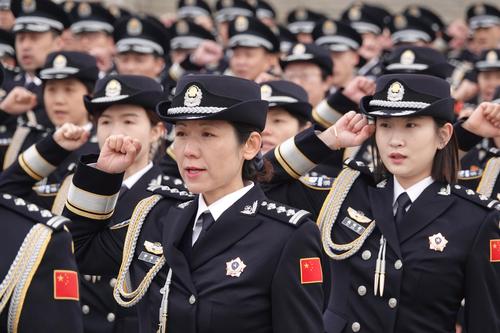图片说明:2022年1月10日,在山东省烟台市公安局,公安干警身着警礼服向警旗宣誓。