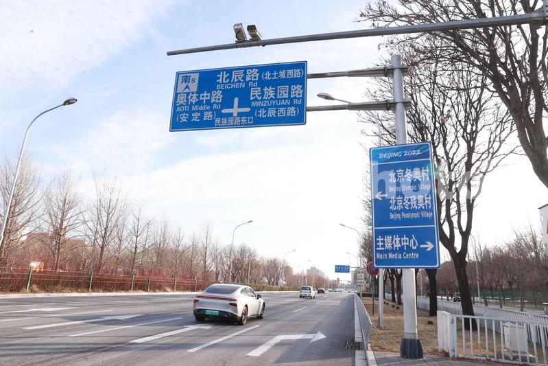 2022年1月8日,在北京朝阳区北辰路拍摄的北京2022年冬奥会冬奥村、冬残奥村、主媒体中心的交通指示牌。