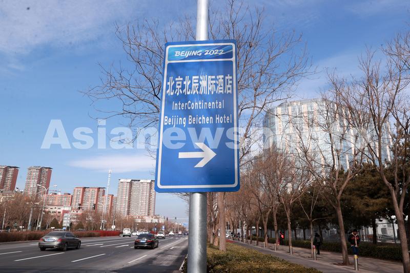 2022年1月8日,在北京朝阳区北辰西路拍摄的北京2022年冬奥会北京北辰洲际酒店交通指示牌。