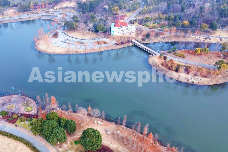 2022年1月9日,无人机拍摄的复苏后的江苏省如皋市龙游河良好的水生态环境。这条河道原是城区的“龙须沟”,通过生态系统治理已蜕变为生态河道,为市民提供了休闲、健身、游玩的共享生态环境空间。