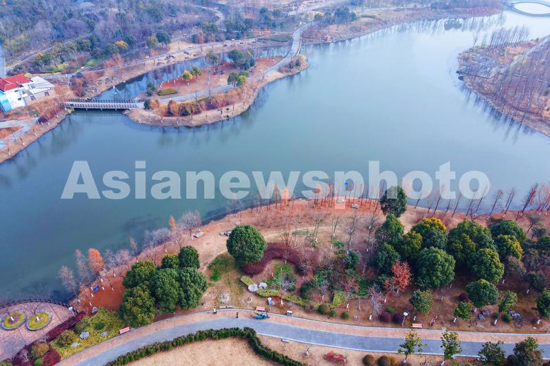 2022年1月9日,无人机拍摄的复苏后的江苏省如皋市龙游河良好的水生态环境。这条河道原是城区的“龙须沟”,通过生态系统治理已蜕变为生态河道,为市民提供了休闲、健身、游玩的共享生态环境空间。