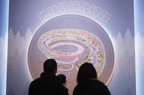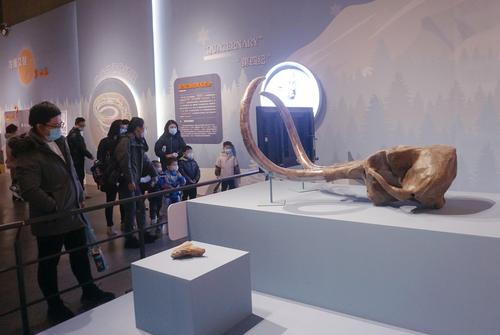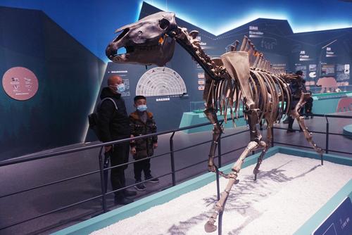 图片说明:2022年1月11日,小观众和家长在浙江自然博物院杭州馆观看原始牛的骨骼化石标本。