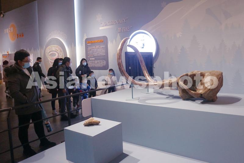 图片说明:2022年1月11日,小观众和家长在浙江自然博物院杭州馆观看幼年猛犸象的头骨化石标本。