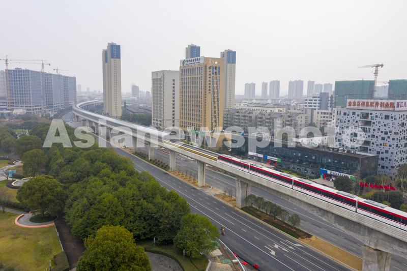 2022年1月11日,浙江省金华市金义东市域轨道交通金义段开通试乘(无人机照片)。
