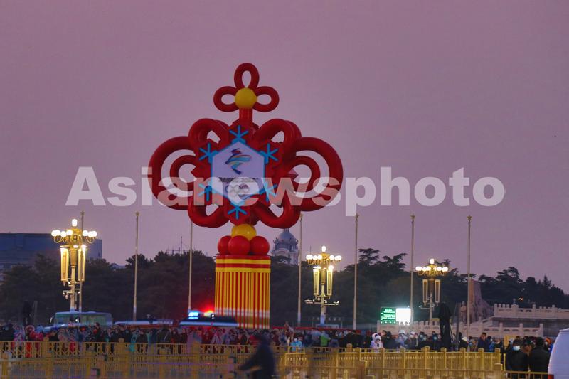 2022年1月14日,北京,春节和冬奥到来之际,镶嵌有2022冬奥会徽的巨型中国结亮相天安门广场。
