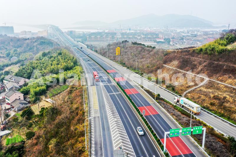 图片说明:2022年1月16日下午,一辆辆汽车平稳有序地驶过舟山跨海大桥(G9211甬舟高速)之一的金塘大桥。