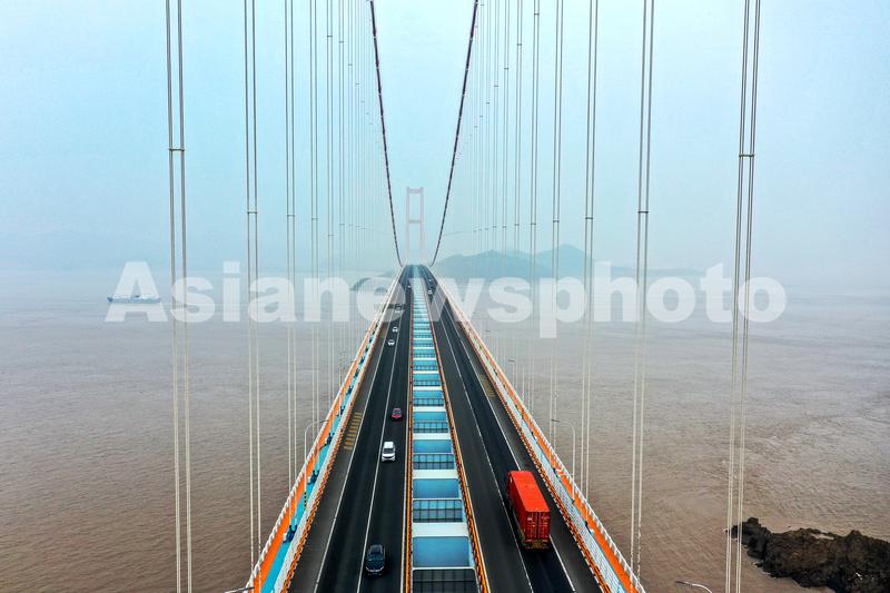 图片说明:2022年1月16日下午,一辆辆汽车平稳有序地驶过舟山跨海大桥(G9211甬舟高速)之一的西堠门大桥。
