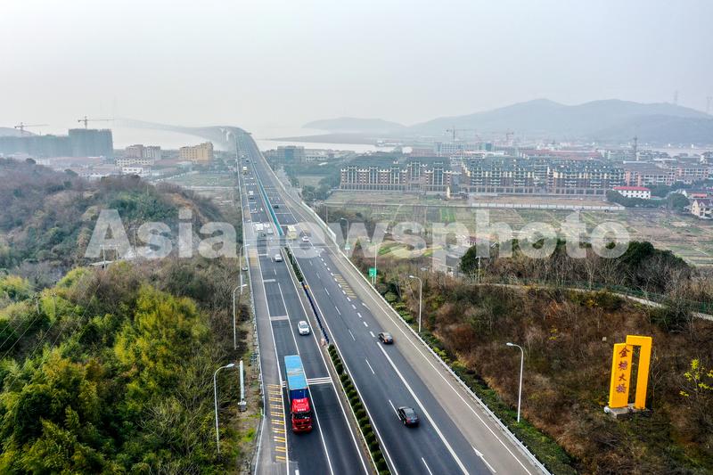 图片说明:2022年1月16日下午,一辆辆汽车平稳有序地驶过舟山跨海大桥(G9211甬舟高速)之一的金塘大桥。